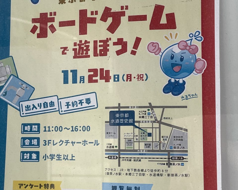 本郷駅近くにある東京都水道歴史館では、2025年11月24日に「ボードゲームで遊ぼう!」が開催されます。水道をテーマにしたさまざまなボードゲームを楽しめる企画で、事前予約は不要、出入りも自由です。当日は、「水道管ゲーム」や「すごろく」など、水の仕組みや水道の大切さを楽しく学べる内容がそろっています。